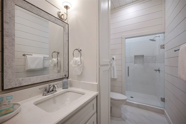 Bright walk-in shower in the second master bath